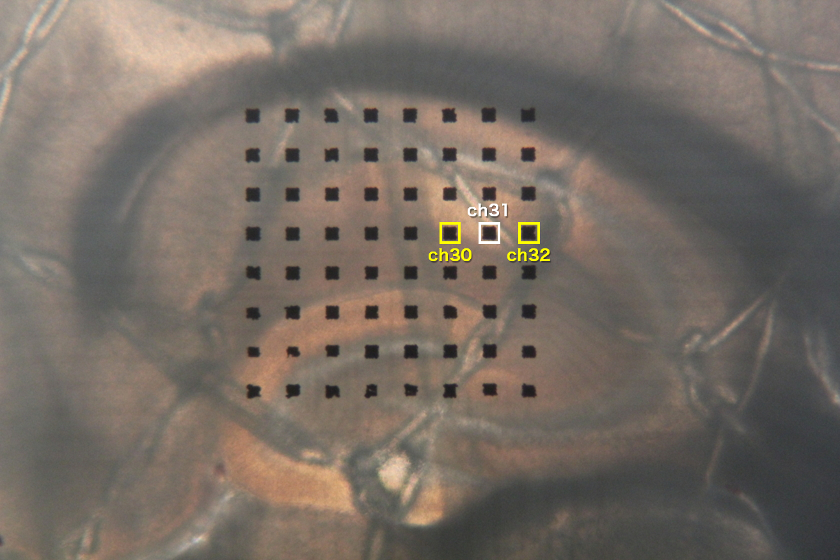 - A mouse hippocampal slice on a MED probe (MED-P515A). Data obtained from an electrode located in the border region between the cortex and the hippocampus (hippocampal white plate) was chosen to analyze epilepsy-like oscillation induced by drug perfusion.