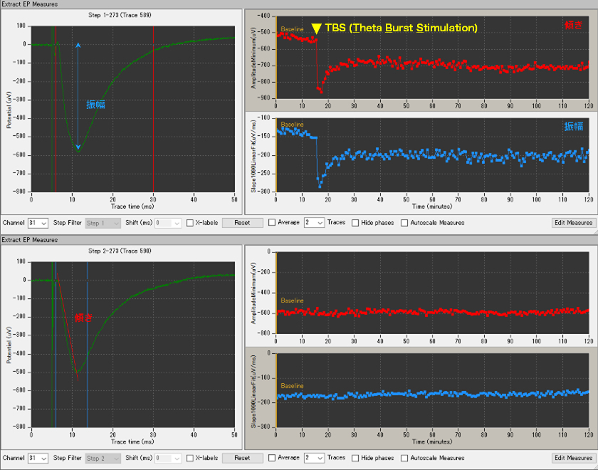 The most popular application of the MED64 System is measuring evoked potentials (EPs) in acute brain slices. The MED64 System has extensive experience with long-term potentiation (LTP) assays, especially in the hippocampus and cerebral cortex. LTP is a phenomenon where the amplitude of potentials evoked by a stimulus at intervals of tens of seconds at a constant intensity is continuously enhanced after a specific stimulation, known as a “tetanus” or “theta burst,” is delivered.