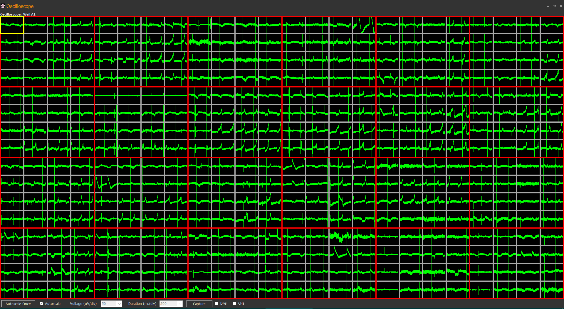 - After applying 14 test compounds as epileptogenic-positive or -negative agents in five incremental doses, data was recorded for 10 minutes for each dose. The screenshot on the left shows a 64-channel oscilloscope window of epilepsy-like waveforms induced by picrotoxin.