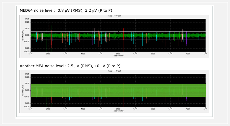 Thanks to the industry's lowest-impedance electrodes, the MED64 can provide the lowest baseline noise level which can reveal important signals that may be hidden by other systems.