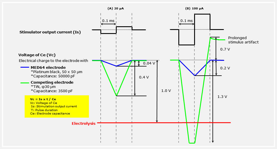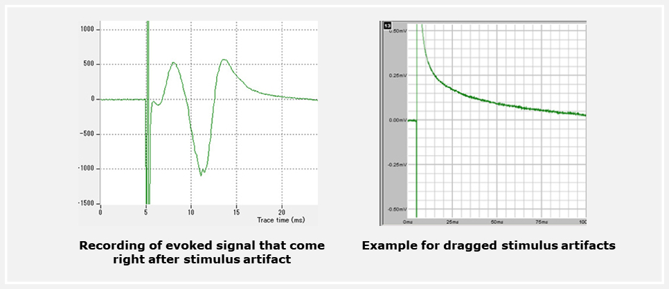 Stimulation using the planar microelectrode is more challenging than recording. One of the reasons is stimulated electrodes need some time to discharge. This phenomenon appears as “dragging of stimulus artifacts”, that interferes signals coming right after the stimulation.