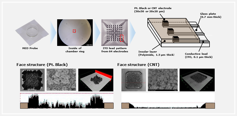 This dilemma can be solved by making electrode surface rough on the nano level. The planar microelectrode of the MED Probe is coated with platinum black using a unique technology that Panasonic/Alpha MED established. This manufacturing method dramatically increases the electrode surface area 100-200x larger and its impedance decreases accordingly.