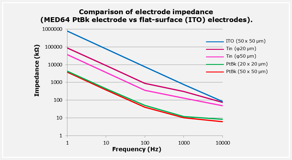 Electrode impedance is a major factor in determining an electrophysiological acquisition system's baseline noise level. Lower electrode impedance results in lower baseline noise level. When using MEAs, having a low baseline noise is the only method to achieve a good signal-to-noise ratio because electrodes do not penetrate into biological samples.